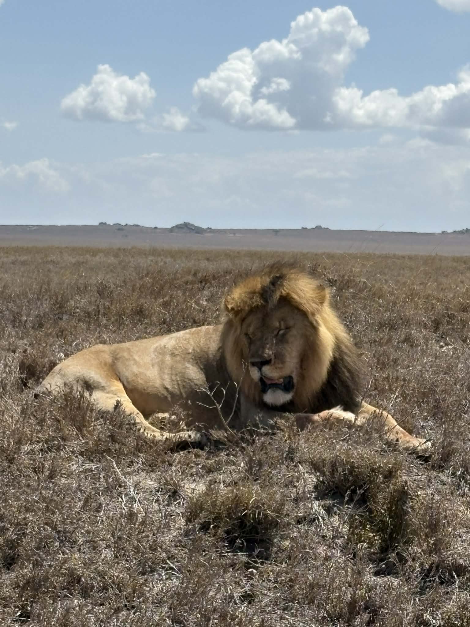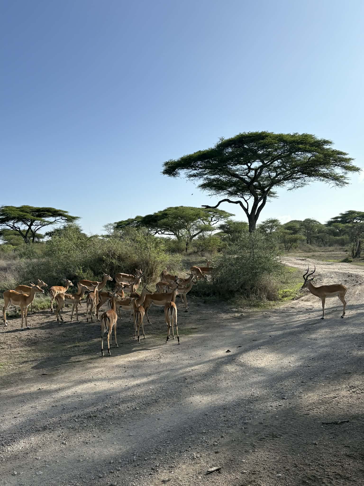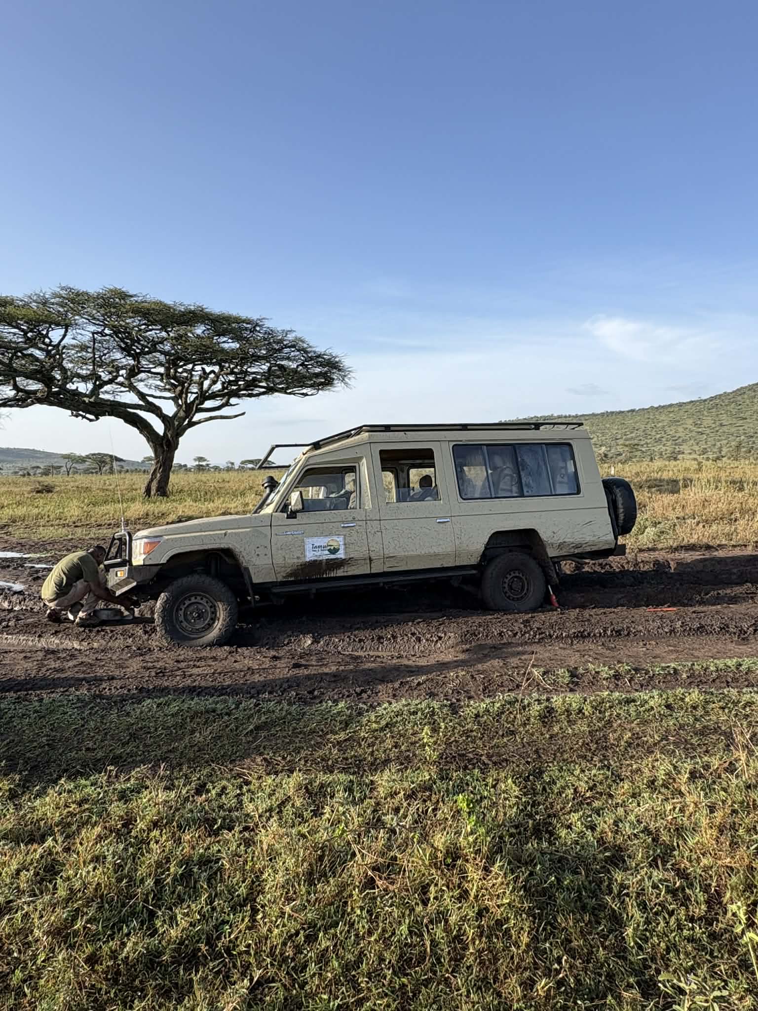 Během následující dní najezdíme stovky kilometrů a projíždíme několik parků – Serengeti, Ngorongoro a Ndutu. Splní se nám vidět tzv. Big Five – lvy, slony, leopardy, nosorožce (i když toho jen jednoho) i buvoly. Zvířata jsou na auta zvyklá, projdou klidně pár metrů, ne-li centimetrů od džípu a ani se neohlédnou. Vnímají auto jako jednotlitý předmět. My jsme ti cizinci. Oni jsou doma. Krajina se neustále mění. Chvíli jedeme po hladké prašné cestě, za chvíli se džíp houpe po výmolech jako na tankodromu. Červený prach, vyprahlá savana, pak zase zeleň a stromy. Hodiny v autě, ale ani na chvíli nuda. Jednou i zapadneme do totálního bahna a musí nás dojet vyprostit.
